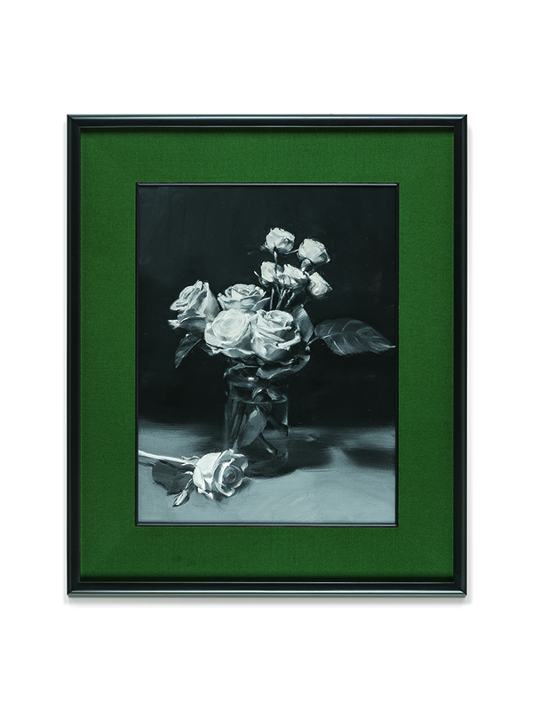지하층의 작업은 전부 흑백의 색으로 묘사되어있었다. 오히려 회화보다는 흑백사진을 연상시키는 이미지들은 죽어버린 꽃을 애도하듯 스산한 기운을 풍긴다. 사실 ‘마네’가 죽기 전 그린 16점의 꽃 그림에서 지하층의 작업은 시작되었다. 이와 같은 강력한 레퍼런스에 대한 변주는 표면적으로 드러나지 않는다. 오히려 작가는 우회적인 방법을 사용하여 쉽게 드러나지 않는 지점에서 관람객이 작업을 더듬어나가도록 유도하는 것 같다. “The last flowers of Manet”이라는 책의 표지는 마네의 꽃 그림 주위의 여백을 녹색으로 채우고 있다. 작가는 지하층 작업 전체에서 꽃 이미지 주위에 이러한 녹색 배경을 만들어 놓는다. 따라서 관람객은 꽃이라는 대상이 아닌 주위의 요소들을 더 유심히 비교할 필요가 있다. 꽃병은 단순하고 액자 또한 검은색 프레임으로 장식 없이 걸려있다. 후술하겠지만 이 전시의 꽃 그림은 어느 하나 시선의 중심에 놓이지 않는다. 가령 회화가 원근법을 비롯한 수많은 환영적 혹은 비환영적 묘사로 자신을 세계보다도 더 세계 같은 혹은 비세계로서 표상된다면 작가는 이런 회화의 표상성을 일부분 포기한다. 물론 이 전시에서 작품들은 충실하게 묘사되어있지만, 그보다도 관람객의 시선을 정체시키는 대상은 화면 밖의 것들이다. 그리고 이런 요소들은 한 번의 관람으로 쉽게 드러나지 않게 은폐되어있다. 따라서 전시는 지하에서 2층까지 작업을 전부 본 후에 다시 보도록 요구하고 있다. 무엇보다 지하층의 작업은 미술사와 강력한 연관성을 가진다. 그리고 이러한 연관성은 표상으로 드러나는 게 아닌 맥락을 통해서 파악된다. 따라서 마네의 마지막 그림이라는 다소 서글퍼 보이는 언명과 동시에 흑백 사진이라는 추억 혹은 과거의 대표적 프로파간다를 작가는 사용한다. 그래서 이 꽃들은 형상적으로 흑백 사진과 유사하면서도 미술사적 맥락에서 마네라는 개인을 소환할 수 있었다.
