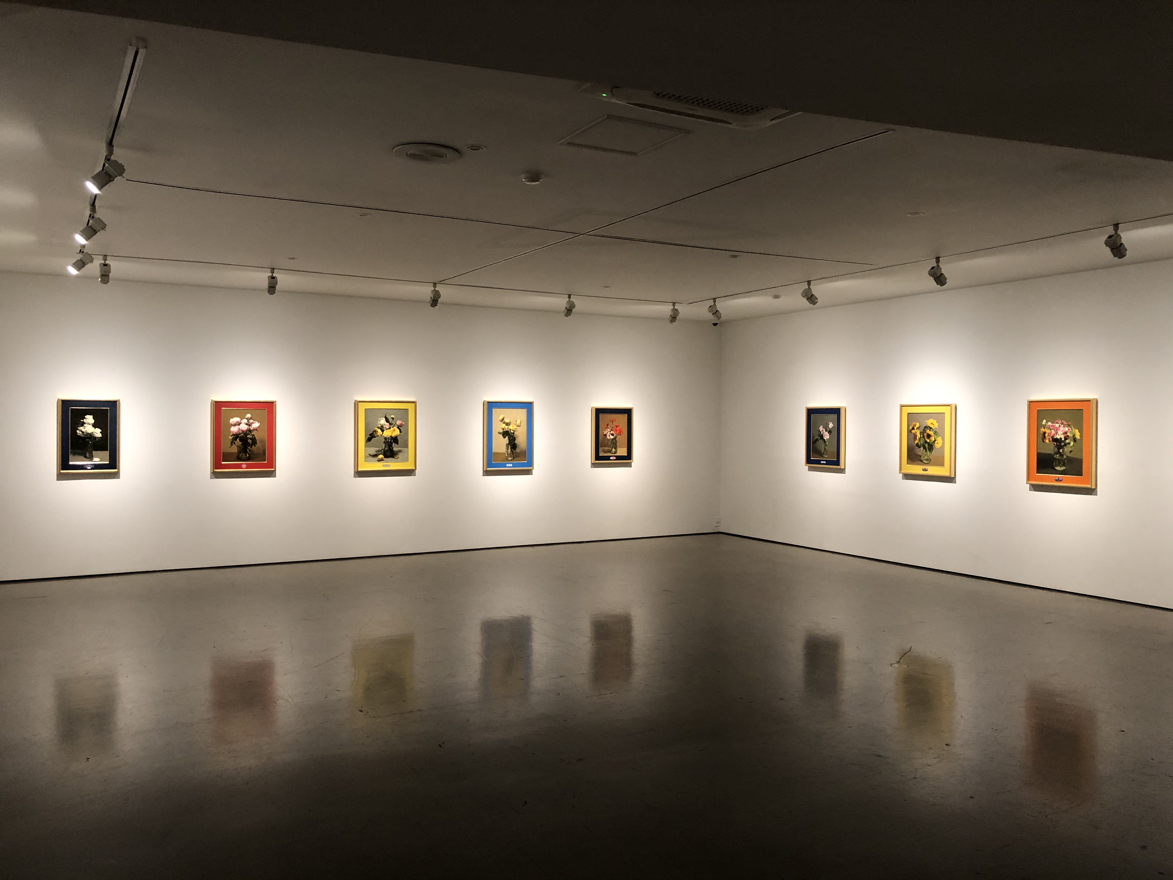 2층으로 올라가게 되면 다시 지하의 작업과 유사한 크기, 형상을 볼 수 있다. 다른 점이라면 화면에 색이 있다는 것과 이미지 주변의 배경색이 작업마다 다르다는 것이다. 거기에 더해 화면 중앙 하단에 ‘로고’들이 프린팅된 것을 알 수 있다. 쉽게 눈치챘을지도 모르지만 이런 전략은 ‘앤디 워홀’에서 작가가 빌려온 태도라고 한다. 작업마다 꽃이 담겨있는 유리병은 공산품이 담긴 병이었고 작가는 이를 세척한 후 꽃을 담아 그렸다. 그리고 완성된 작업마다 해당 제품의 회사 로고를 인쇄했다. 유리병이라는 점에서 알 수 있듯이 대부분의 회사가 액상의 소스를 병에 담아 파는 곳임을 쉽게 찾을 수 있다. 공산품과 로고가 워홀에게 직접적으로 영향받은 전략의 일부라고 할 수 있으며 전시장 전체에서 꽃 그림이 반복된다는 점도 참고할 수 있다. 하지만 지하와 1층에서 파악되는 다소 폐쇄적일 정도로 내적인 맥락들과 달리 ‘현대 사회에 대한 비판적 제스처’가 등장하자마자 작품은 빠르게 유치해진다. 비록 작가는 반복된 형상을 보여줌으로써 이를 극복하려고 했지만 실크 스크린으로 복제된 듯한 무성의한 워홀의 형상을 마주할 때 느껴지는 무관심함과 달리 작가의 이미지는 신경 써서 시선을 던지게 되는 ‘묘사’된 작업이다. 따라서 반복된 꽃과 공산품 병이 워홀식의 정신분열증적인 자본주의에 대한 허무주의 비판을 답습하는 시도라고 본다고 해도 결과적으로 남는 것은 꽃 자체의 섬세히 그려진 공허한 이미지라는 모순뿐이다.